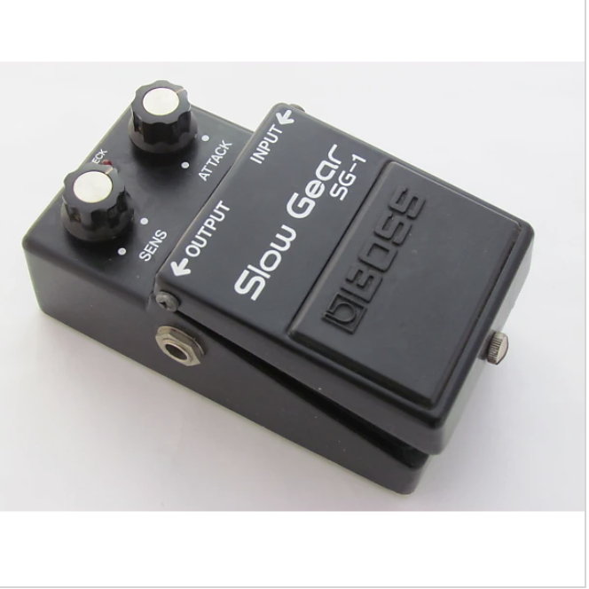 9. Boss SG-1 Slow Gear In the 1980s, guitar players were exposed to the Boss SG-1 Slow Gear effects pedal. The Boss SG-1 Slow Gear is a rare and unique pedal that creates a volume swell effect. It's perfect for creating ambient and atmospheric guitar sounds. Its "slow attack" affect is meant to imitate a bowed instrument or a volume pedal. The guitar signal's volume is increased steadily over time to achieve a lush, swelling effect. The SG-1 can be used in either "LATCH" mode, which maintains the intensity at its maximum, or "MOMENTARY" mode, which activates the effect only when the footswitch is depressed.