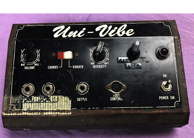 2. Shin-Ei Uni-Vibe The Shin-Ei Uni-Vibe is a vintage-style pedal that emulates the sound of a rotating speaker. Create a one-of-a-kind, psychedelic sound with the Shin-Ei Uni-Vibe guitar effects pedal. It first appeared in the 1960s, and guitarists like Jimi Hendrix and David Gilmour helped propel its popularity. Using a photocell to modulate the phase of the signal creates a rich, enveloping effect that is reminiscent of the sound produced by a rotating speaker. Psychedelic rock, funk, and blues all make frequent use of the Uni-Vibe. Many companies have reissued and redesigned this pedal over the years, but the Shin-Ei original remains a collector's and musician's dream.